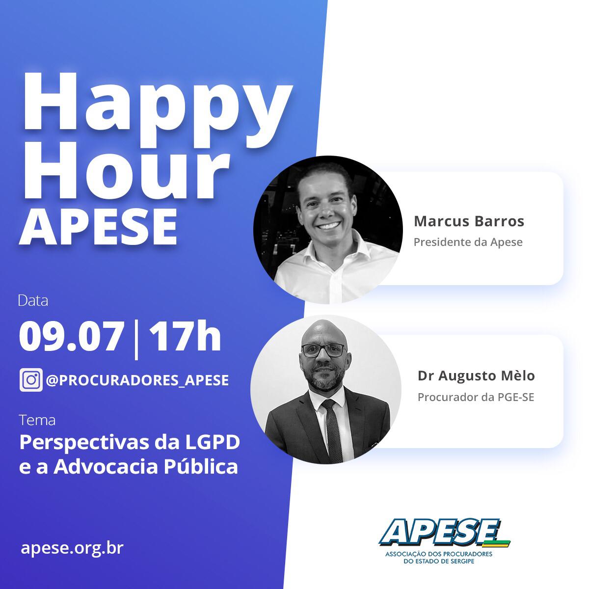 Nesta quinta-feira, dia 9 de julho, em mais uma edição do Happy Hour APESE, às 17h. Dr Marcus Barros, presidente da APESE, fez um bate-papo com o Procurador do Estado de Sergipe, Dr Augusto Mèlo, sobre “Perspectivas da LGPD e a Advocacia Pública” e também sobre o projeto da Editora APESE.